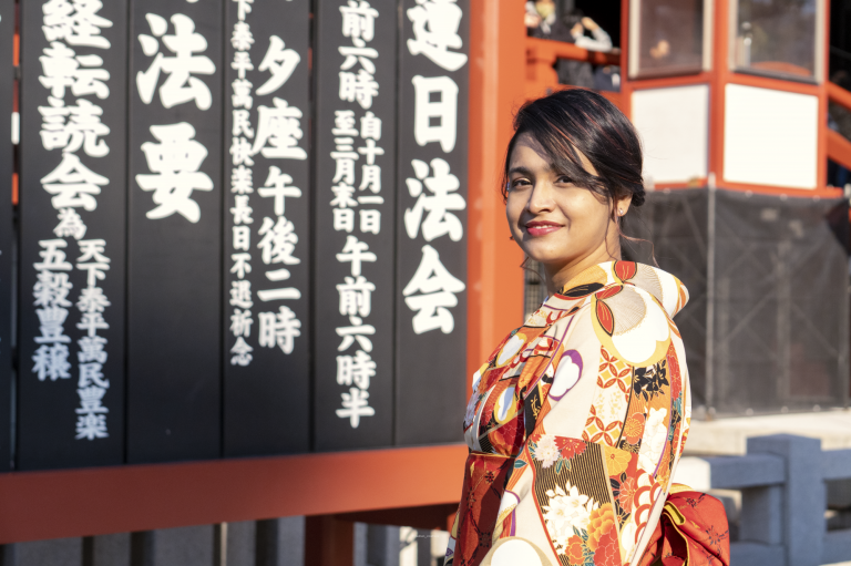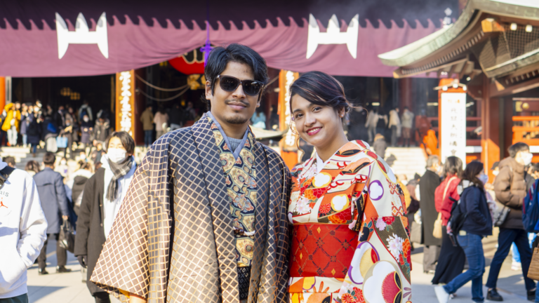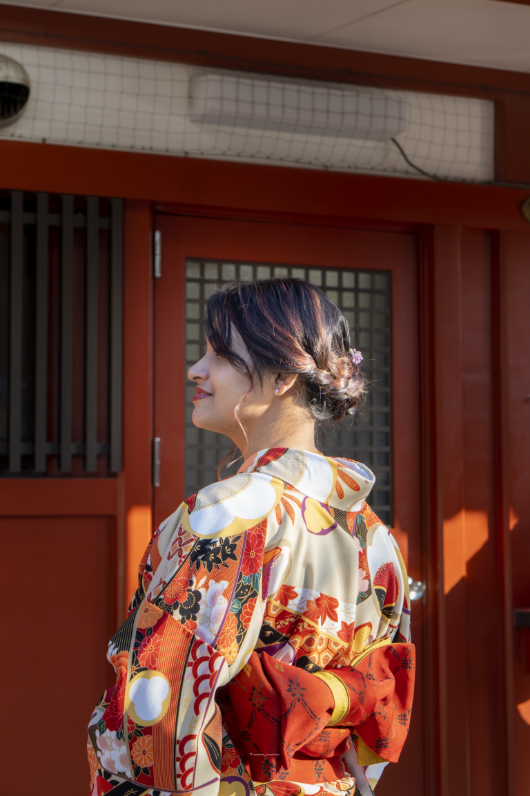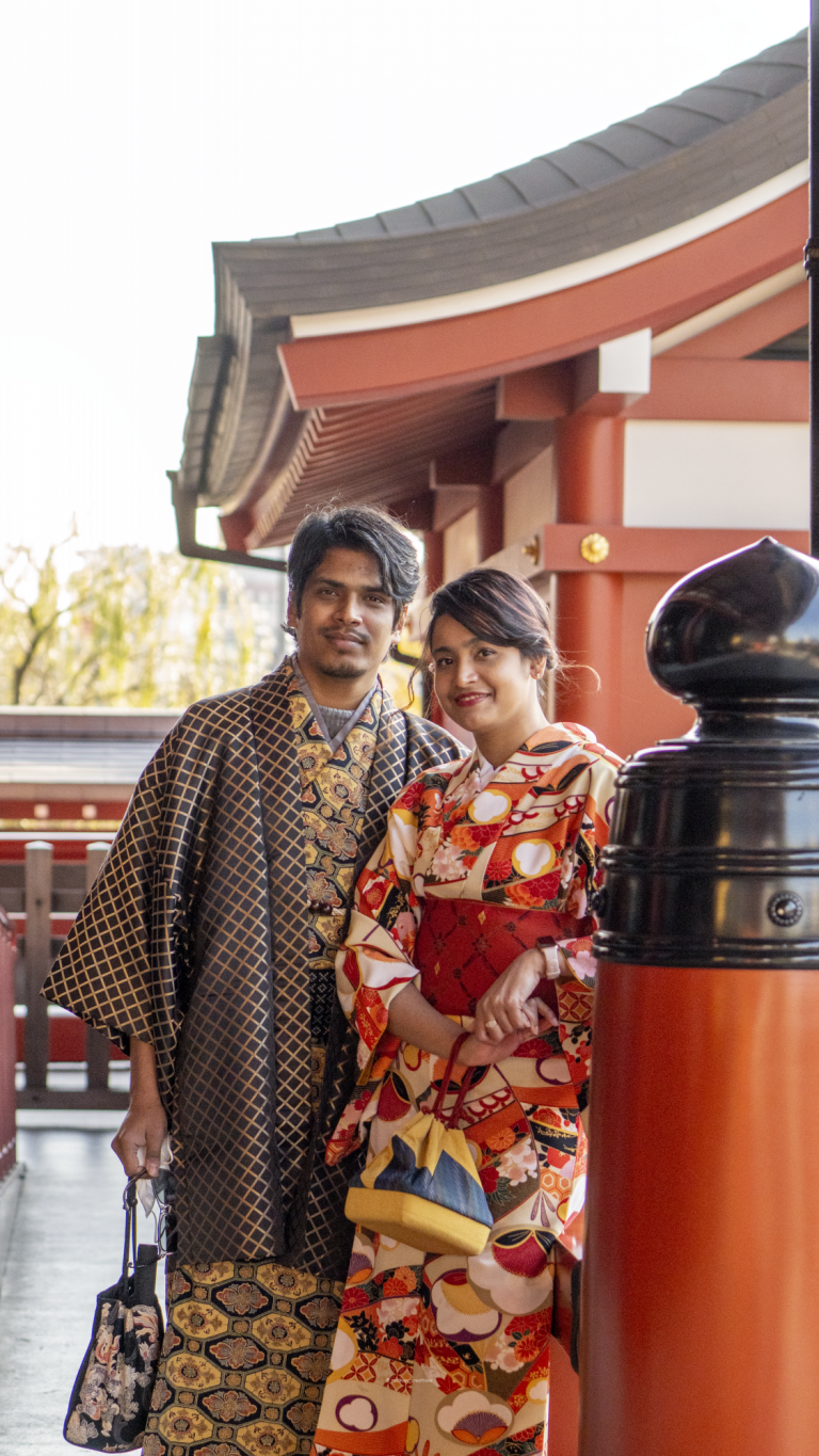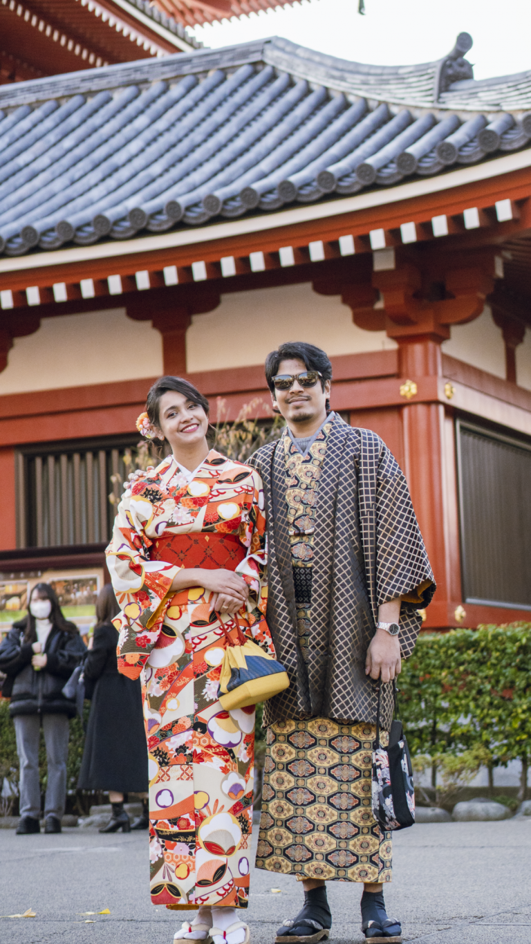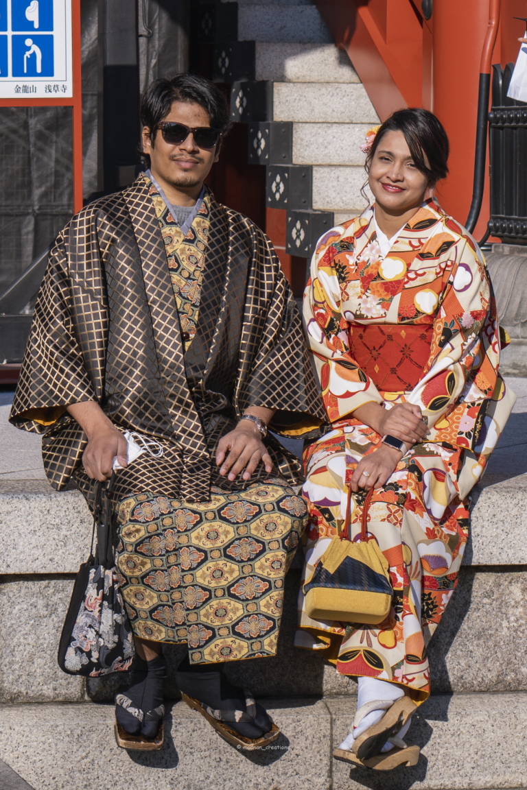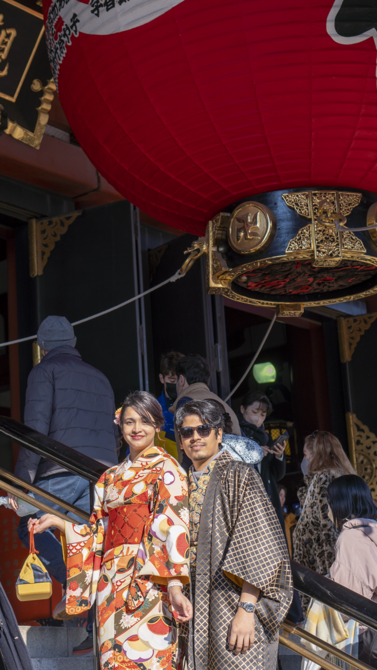 You just need to find a Japanese Kimono rental shop. You can even do it online. We found a shop near the popular Sensoji Temple, in Asakusa, Tokyo. On the date of the reservation visit the shop, choose your favorite color and pattern of the clothe you want to drape. The staff of the shop will do everything else, starting from hair and accessories. It took the staff only 20 minutes to put this beautiful clothe on me. Then we were out walking and getting the vibe of Sensoji temple. Maisha chose a pattern with flowers and autumn leaves in red color because of her love for nature and vibrant colors. Adnan went with a black and golden pattern. The rental was 7000yen/person and the time you can wear varies according to the shop you choose.